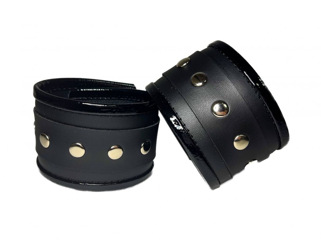 Красивые и функциональные наручники черного цвета, выполненные из искусственной кожи. Декорированы металлической фурнитурой и лаковыми вставками по краям. Обхват удобно регулируется с помощью пряжек. В комплекте идет соединение с карабинами. Очень экономичный, экологичный и практически незаменимый аксессуар для вашей любовной игры! Ширина - 5,5 см.