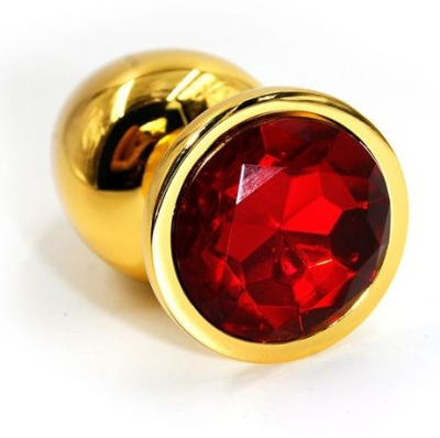 Золотая анальная пробка из алюминия размер S. Страз в основании круглой формы, выполнен из стекла красного цвета. Упакована в вельветовый мешочек для хранения. Вес - 52 гр.