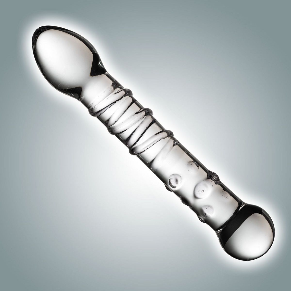 Стимулятор выполнен из кристально чистого закалённого стекла, с выраженным рельефом из спирали и пупырышек и крупными головками на основаниях.