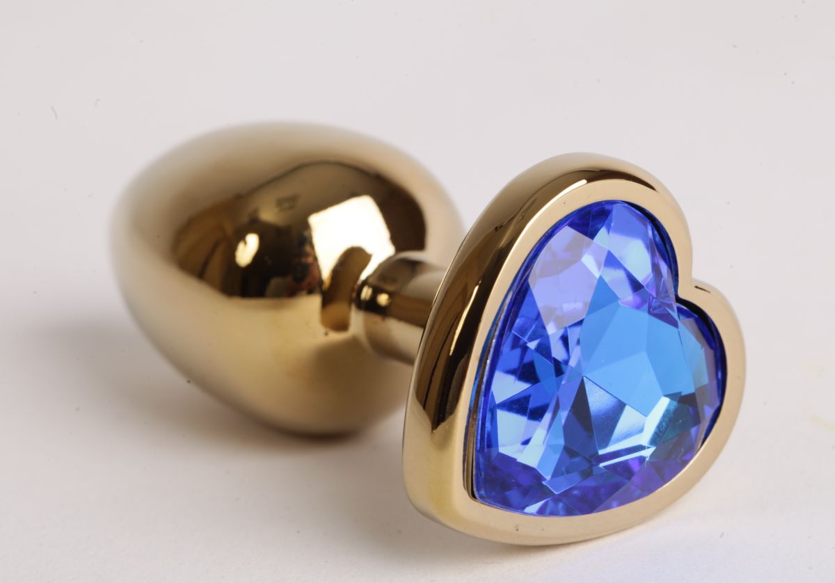 Золотистая анальная пробка с синим стразиком-сердечком - 7,5 см.
