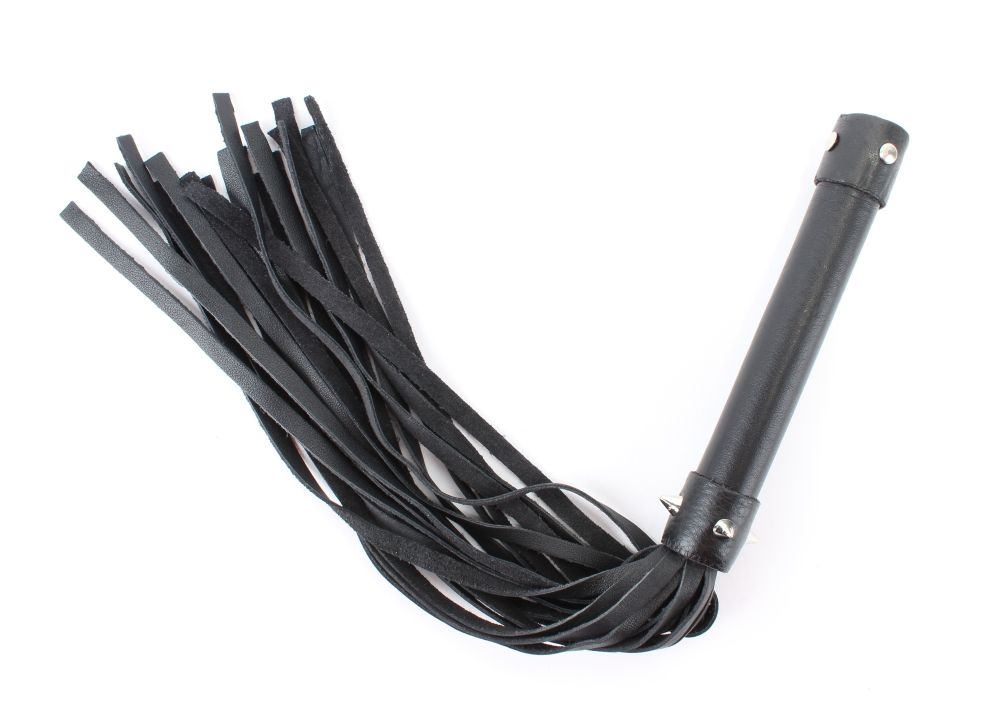Плеть выполнена из натуральной кожи черного цвета. Ручка обтянута гладкой кожей и декорирована шипами. Количество хвостов - 20 штук. Стильный аксессуар поможет воплотить эротические фантазии в реальность. Длина хвостов - 28 см.