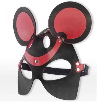 Маска мышки из красной и черной натуральной ременной кожи с миндалевидными прорезями для глаз, украшенная металлическими заклёпками серебристого цвета. Для максимального комфорта маска имеет бархатистую велюровую подкладку, обеспечивающую приятные тактильные ощущения при соприкосновении с кожей лица. Фиксирующая резинка с пряжкой позволяет легко регулировать размер изделия.