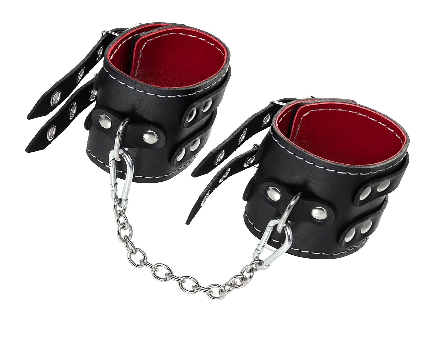 Эти кожаные оковы с двумя ремнями и красной подкладкой могут стать стильным аксессуаром, а могут послужить вашим целям по своему прямому назначению.